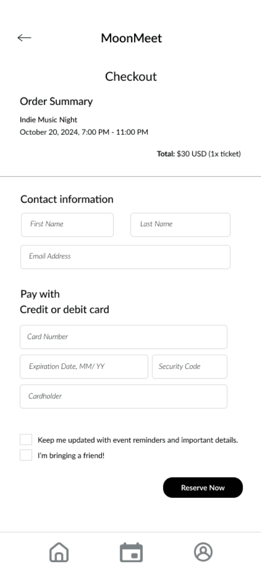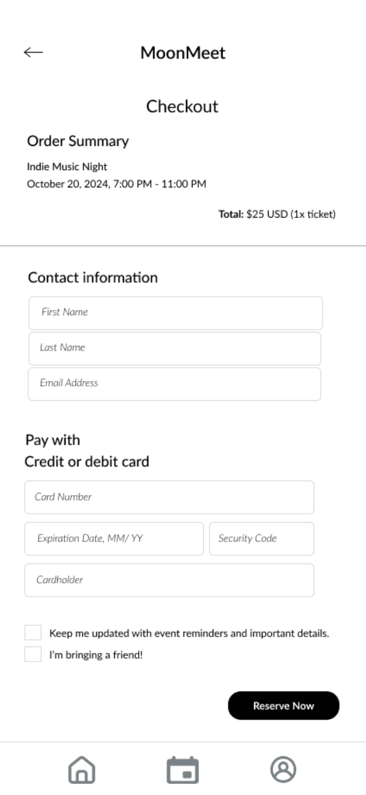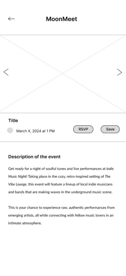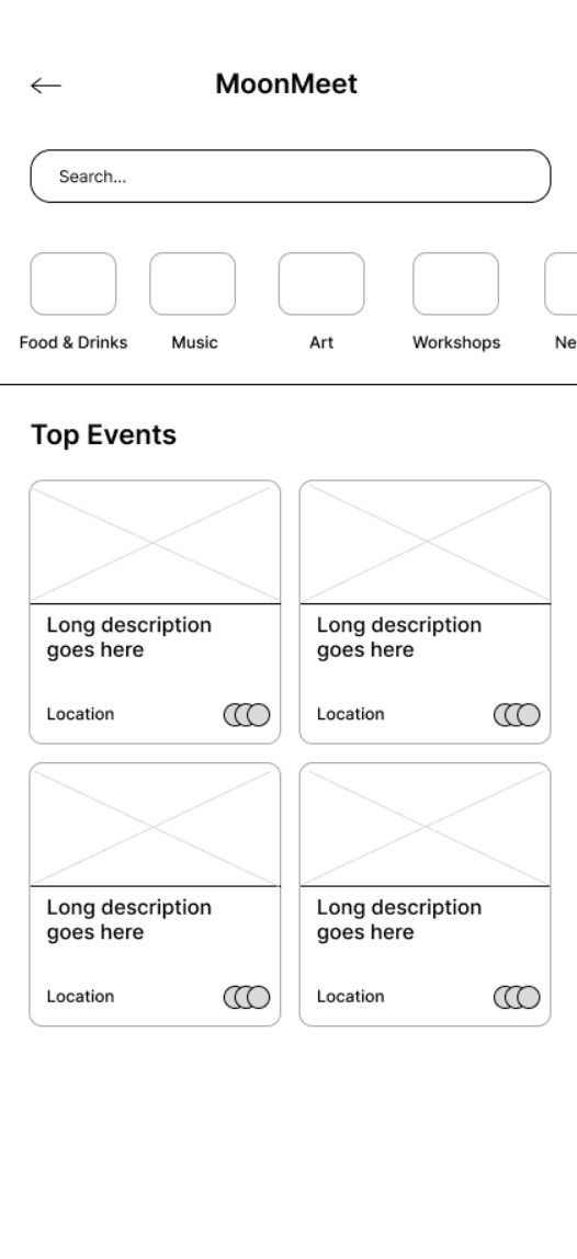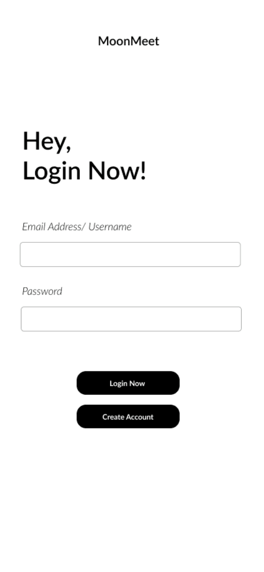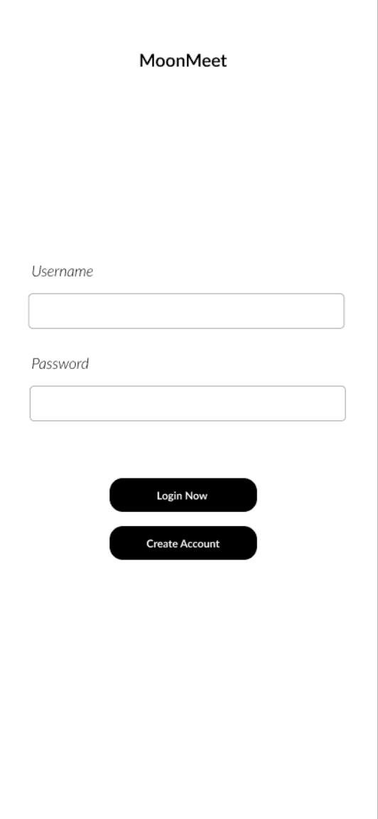 The low-fidelity prototype for MoonMeet was created to test initial design ideas, get quick feedback on layout and functionality, and set the foundation for usability testing.