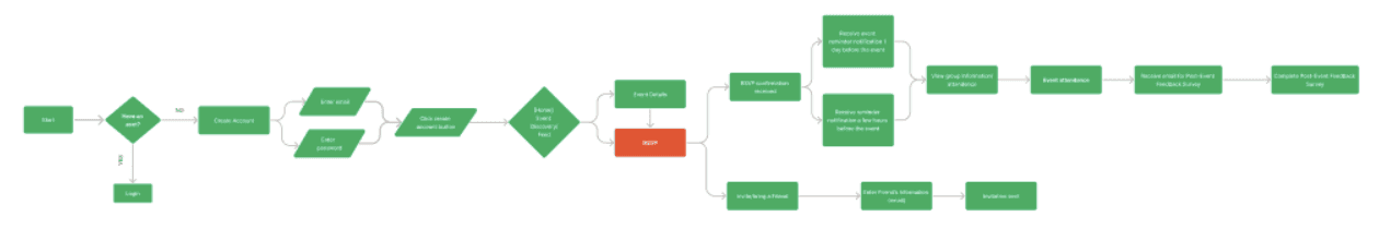User flows were designed to map the journey users take to complete key actions on the MoonMeet app. These flows detail the steps and choices users make, from discovering events to RSVPing, attending, and interacting with other participants.